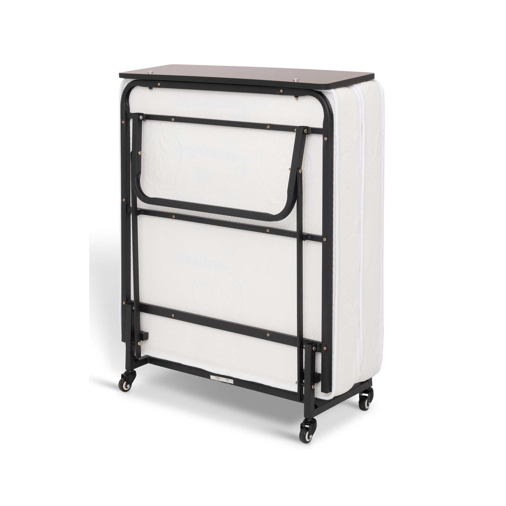 The folding mechanism is straightforward - housekeeping staff can set up or fold away the bed without complicated steps. When folded, it stores vertically at just 36 x 95 x 104cm, useful when storage space is limited.